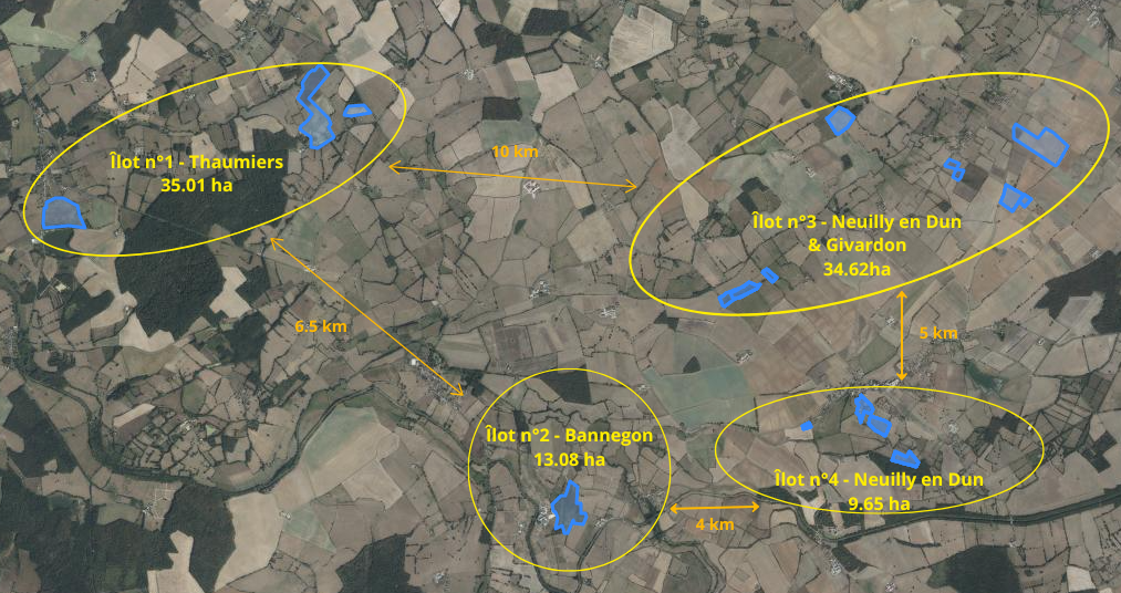 - îlot 3 : 34.62 ha de parcelles agricoles (remise en état à prévoir) regroupées sur les communes de Neuilly-en-Dun et Givardon.