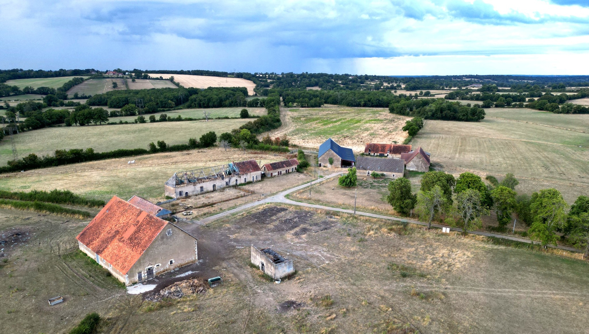 Bâtiments et équipements Le bien comprend un hangar de 120 m² (10 x 12 m), bardé sur trois faces en tôle, avec murs et dalle en béton, destiné au stockage à plat.
