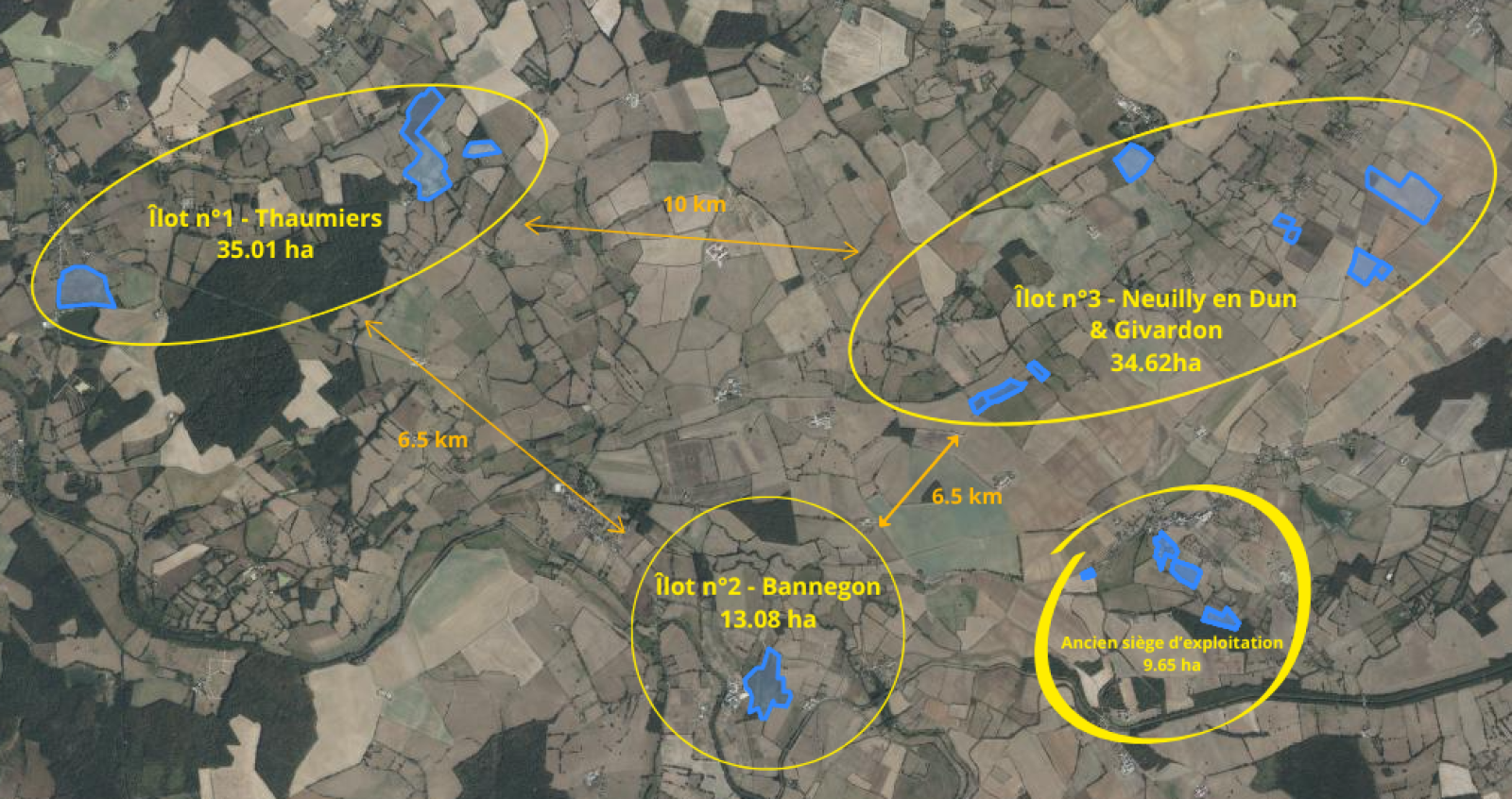 - îlot 3 : 34.62 ha de parcelles agricoles (remise en état à prévoir) regroupées sur les communes de Neuilly-en-Dun et Givardon.