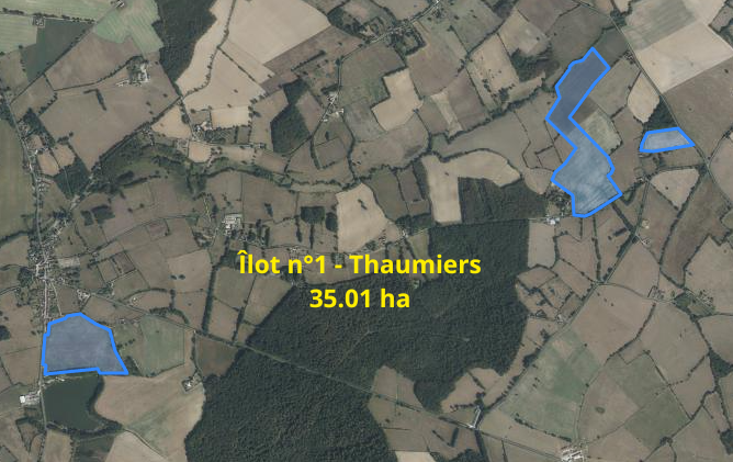 - îlot 1 : 35.01 ha de parcelles agricoles (remise en état à prévoir) regroupées sur la commune de Thaumiers.